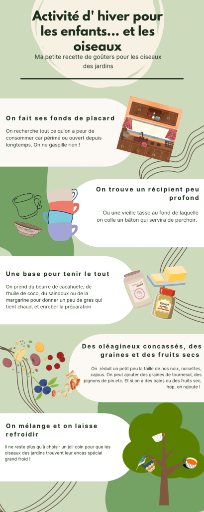 Le savais-tu ? Donner du pain aux oiseaux, c’est mieux que rien, mais ça n’est pas très nourrissant pour eux. Ca leur suffit en été par exemple, mais par temps froid, ils recherchent des protéines et des graisses pour passer l’hiver. Je suis sûre que tu aurais aimé l’apprendre de façon ludique.